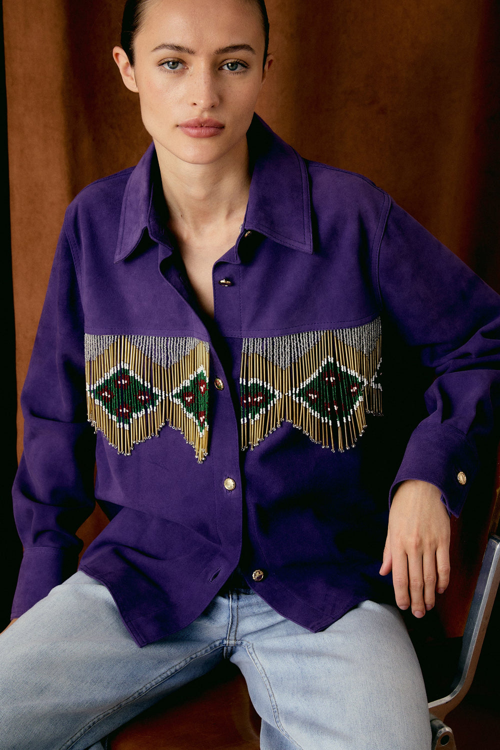 Camisa confeccionada en 100% piel de ante. Corte Regular fit, cuello camisero y cierre con botones con snaps. Manga larga y terminación en puño con cierre de botones de snaps. Detalle de flecos en parte delantera en pecho y trasera confeccionados con cuentas.