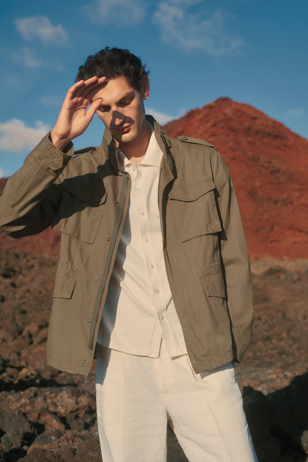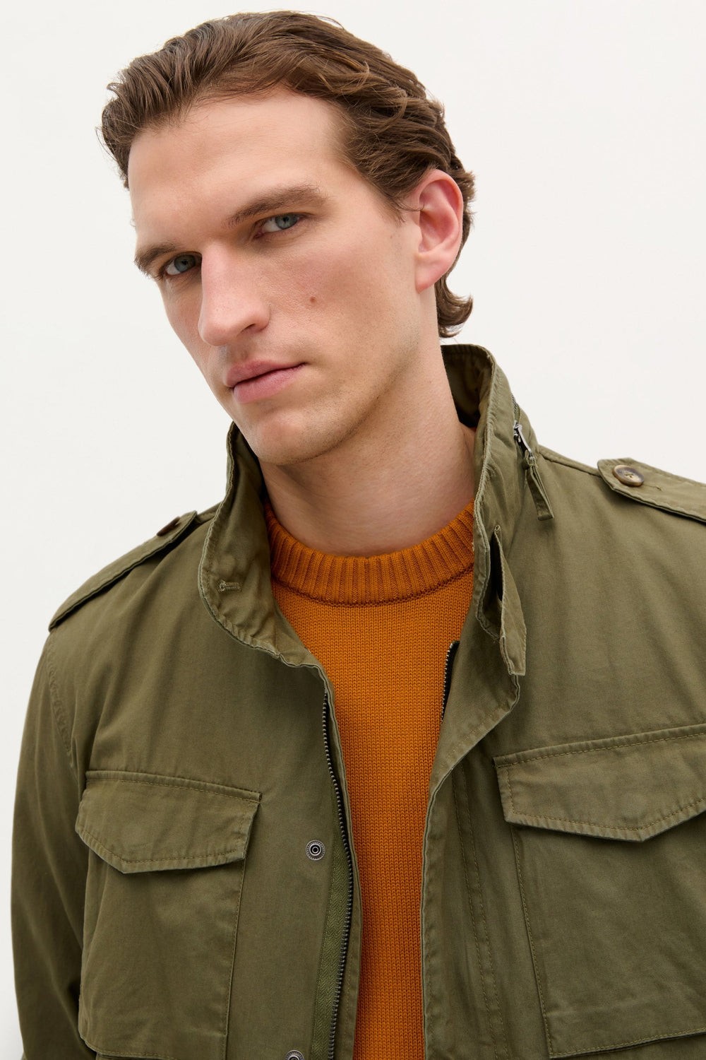 Chaqueta estilo militar confeccionada en 100% algodón BCI. Corte regular fit, cuello con capucha desmontable con cremallera. Cierre con cremallera de doble carro y snaps. Manga larga terminada en puños con cierre de snap y fuelles en la parte trasera.