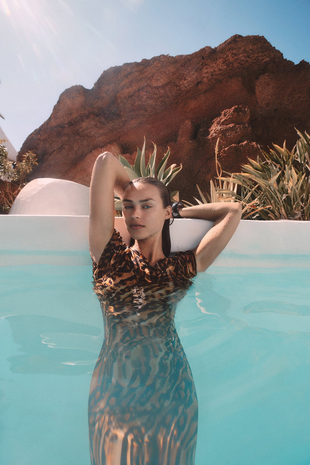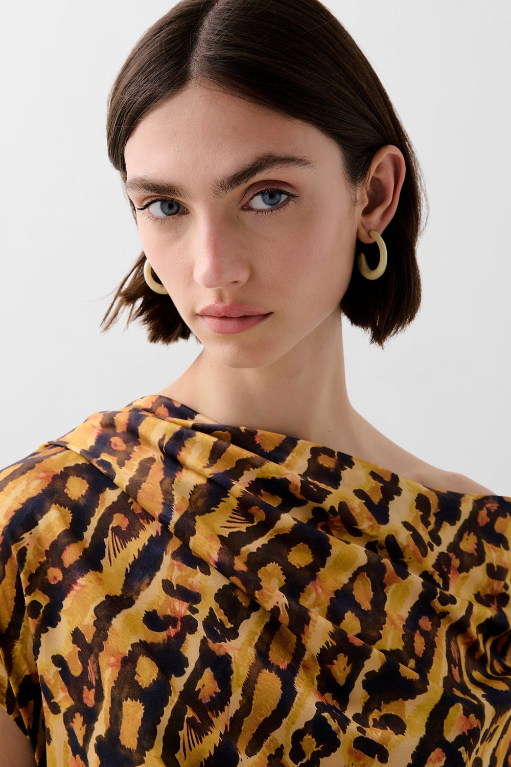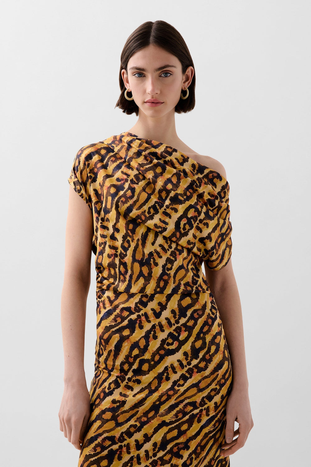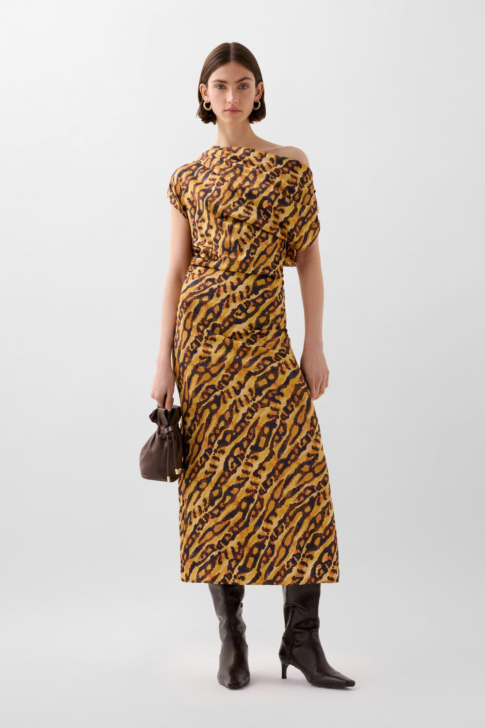 Vestido de corte midi. Escote asimétrico. Manga corta. Cierre mediante cremallera en la parte lateral. Un hombro descubierto. Tejido fluido de acabado satinado. Slim fit