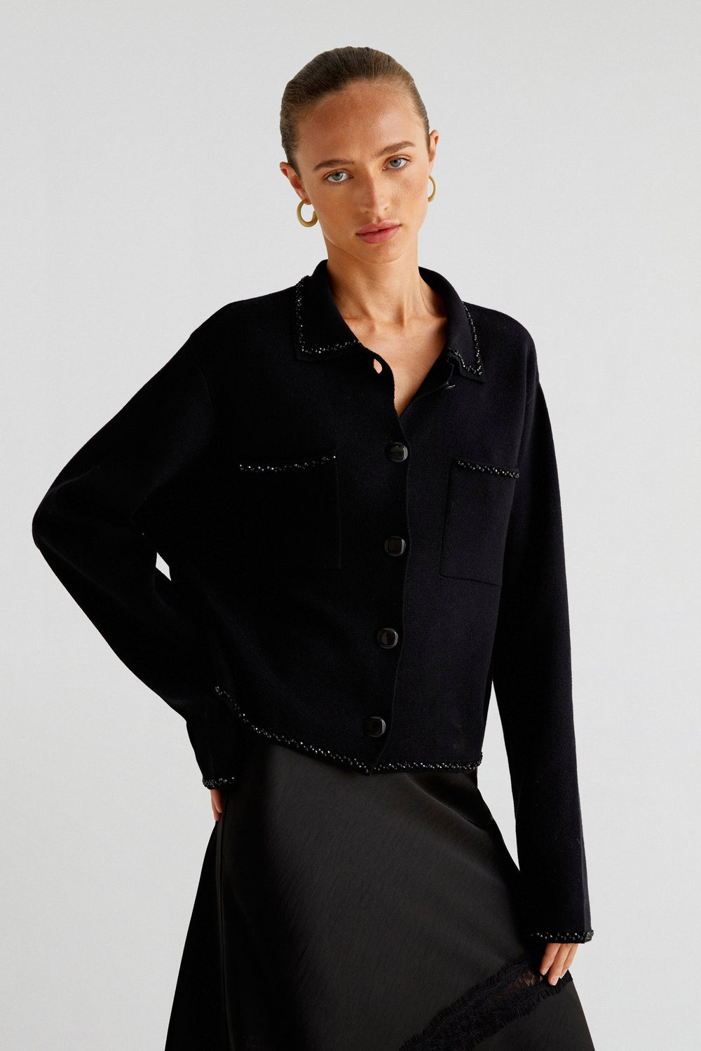Cárdigan confeccionado en mezcla de lana. Regular fit, cuello clásico y cierre con botones. Manga larga y bolsillos. Detalle abalorios.