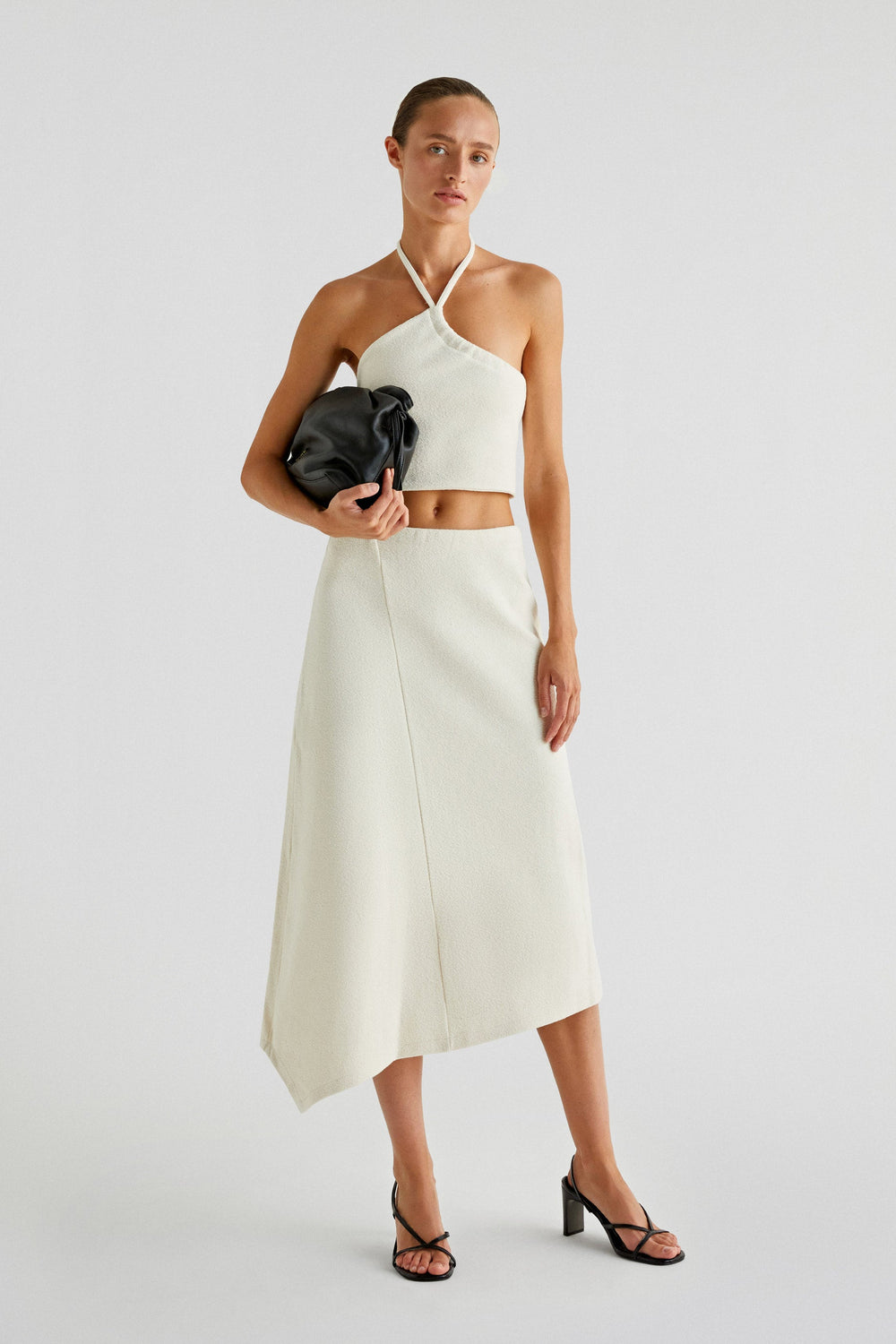 Falda midi de punto grueso confeccionado en 100% algodón. Regular fit, cinturilla elástica y costuras marcadas. Bajo asimétrico.
