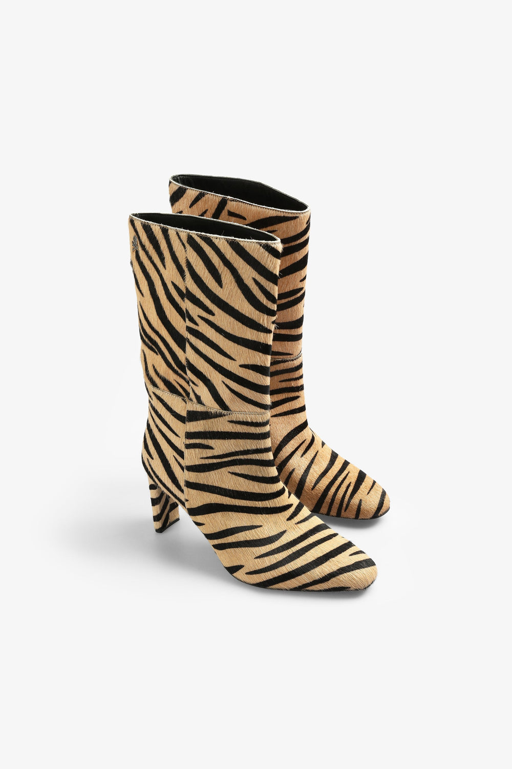 Botas de inspiración de cebra confeccionadas en 100% piel. Caña media, tacón alto y detalle de calavera metálica.