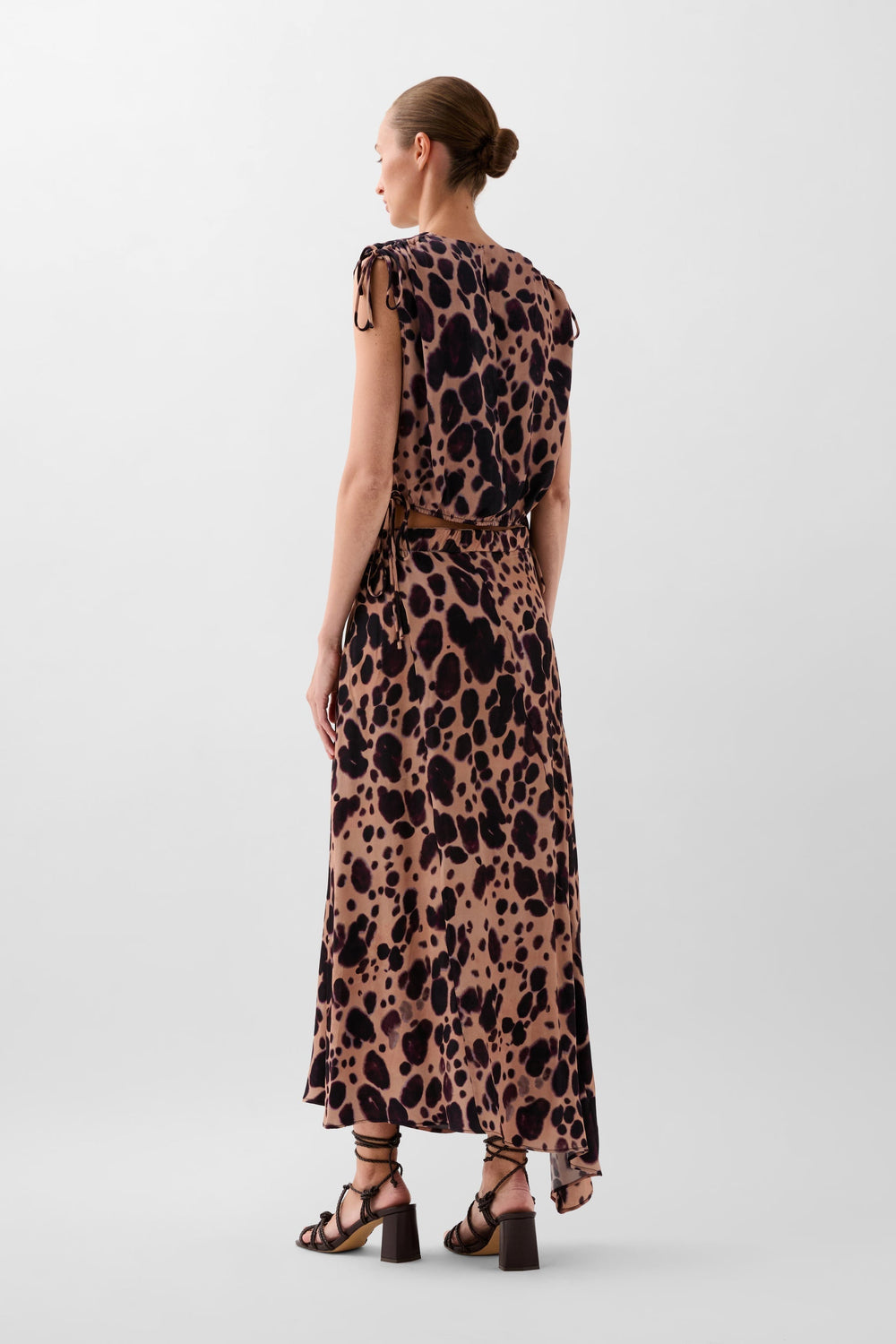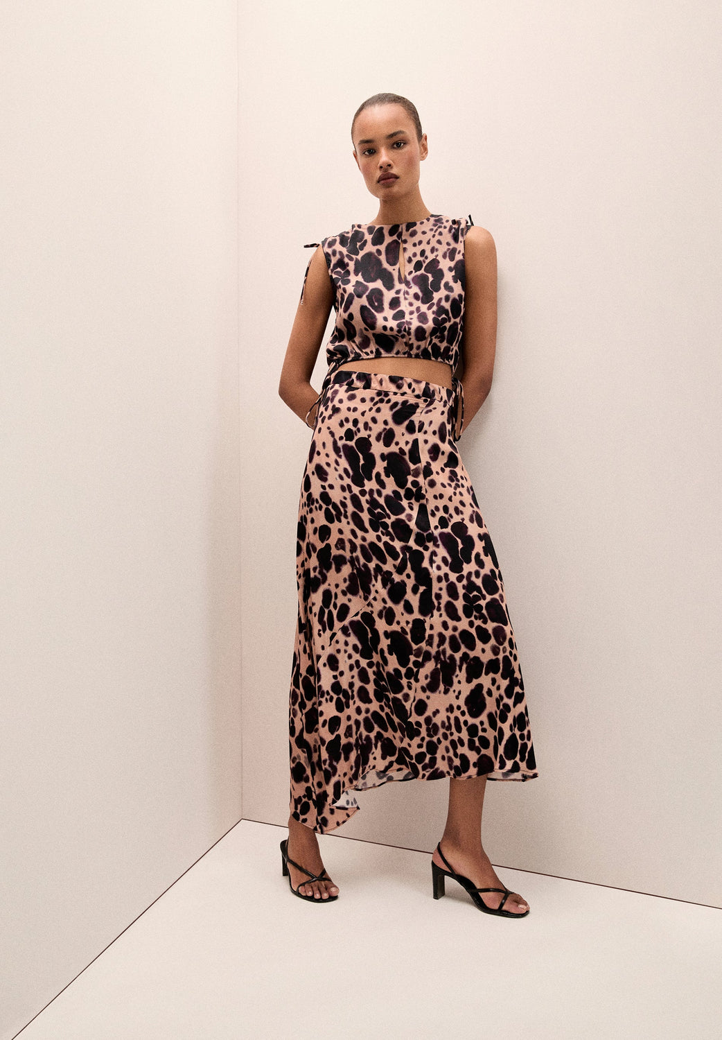 Falda midi estampada animal print confeccionada en tejido satinado fluido. Corte asimétrico en el bajo con cierre de cremallera lateral.