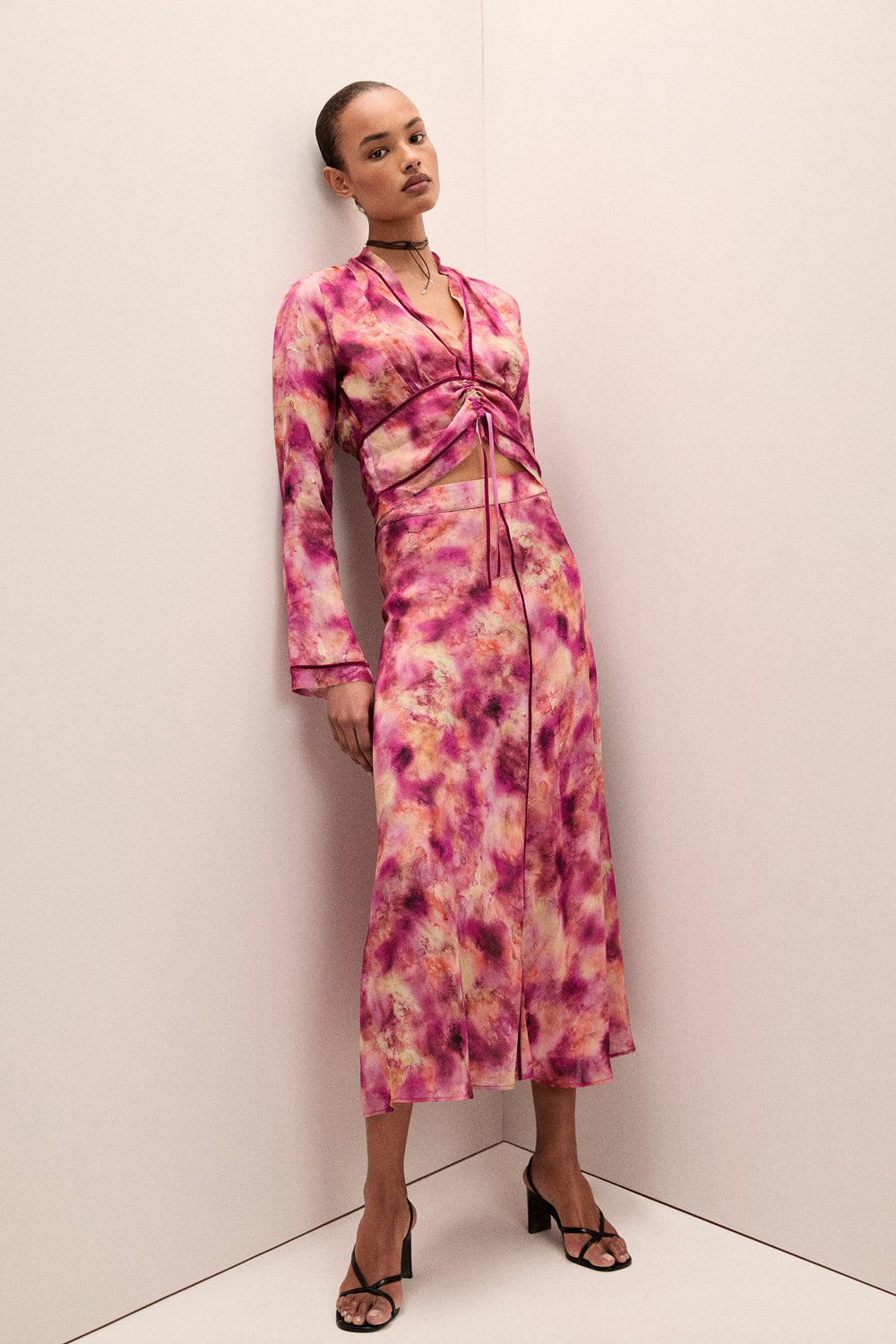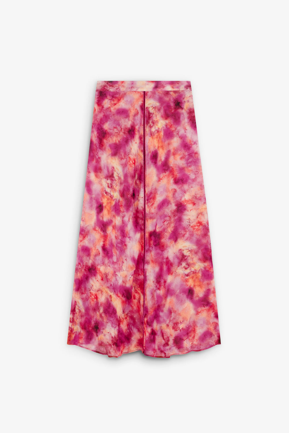Falda larga confeccionada en tejido fluido con estampado de tie dye. Corte midi, silueta ligeramente A Line con detalle de ribete de terciopelo. Cierre con cremallera oculta trasera.