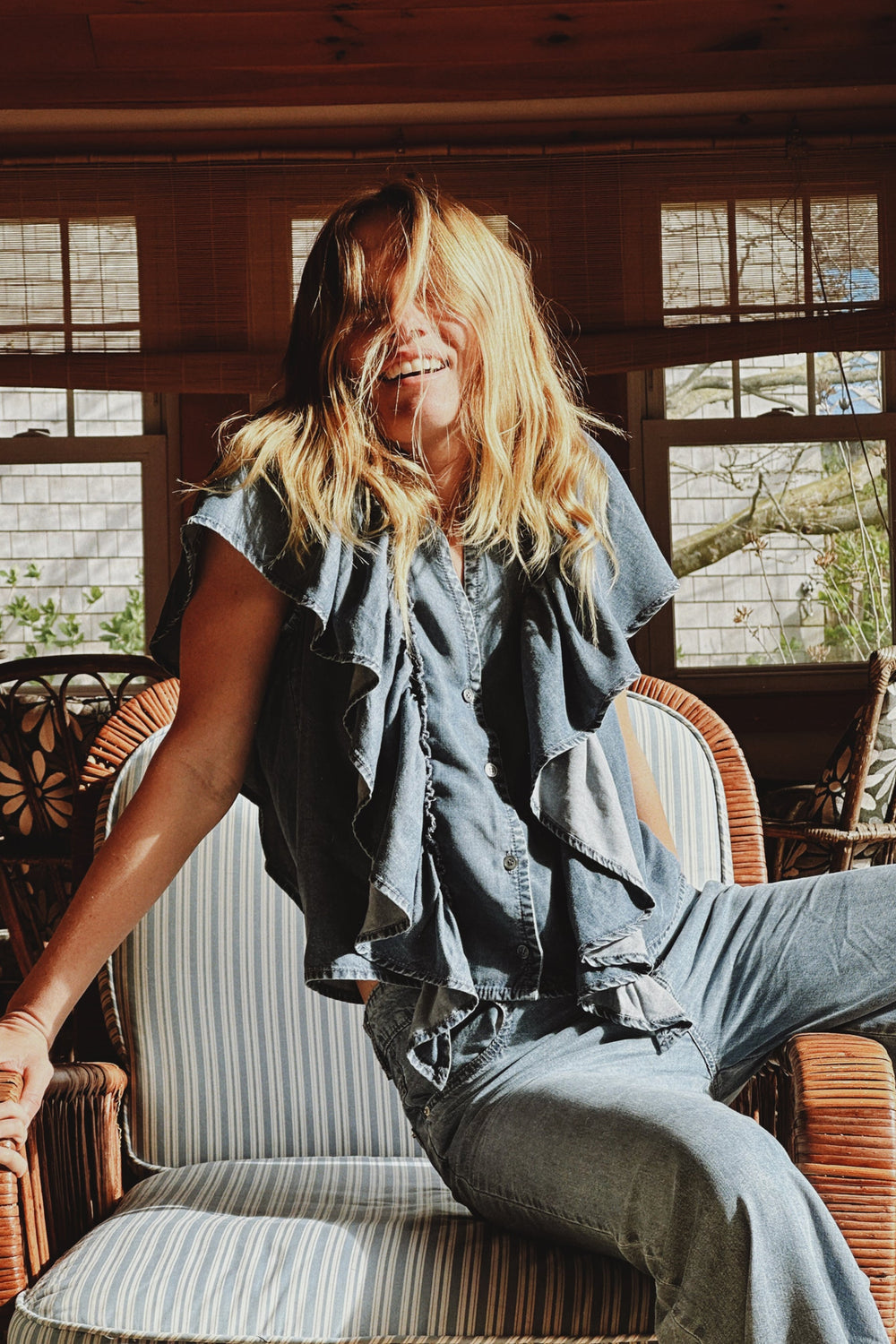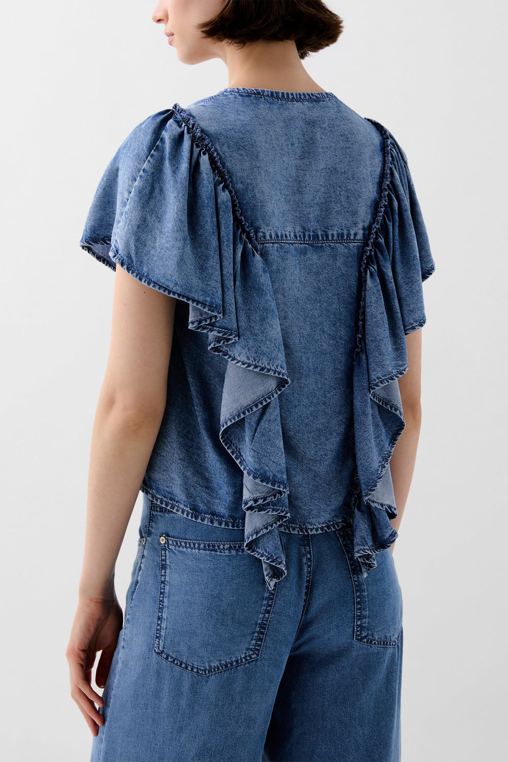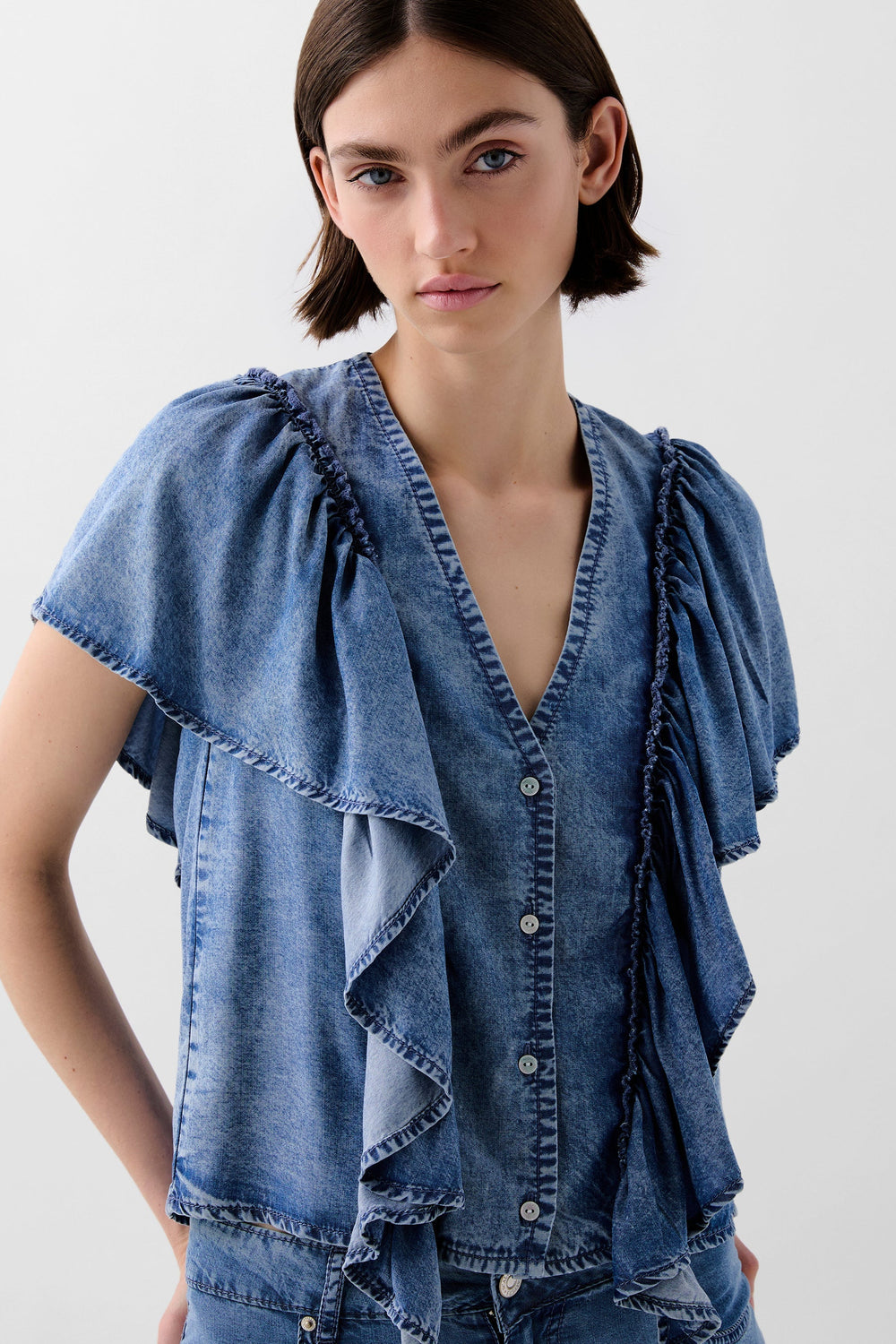 Camisa confeccionada en tejido fluido efecto denim. Corte Regular fit, escote en V, manga en sisa con volante en hombro que continúa en pecho y espalda. Cierre con botones.