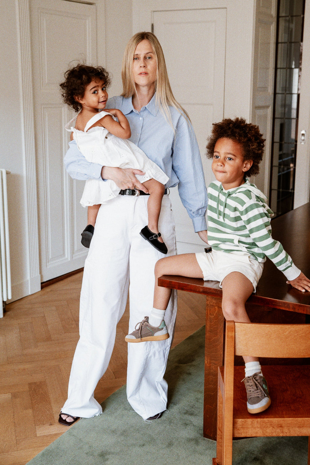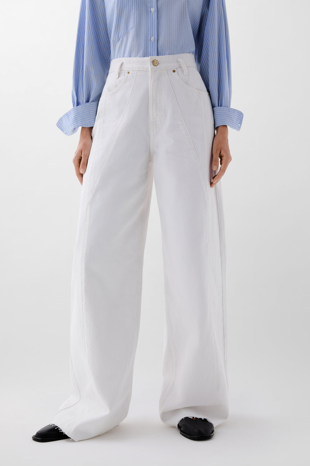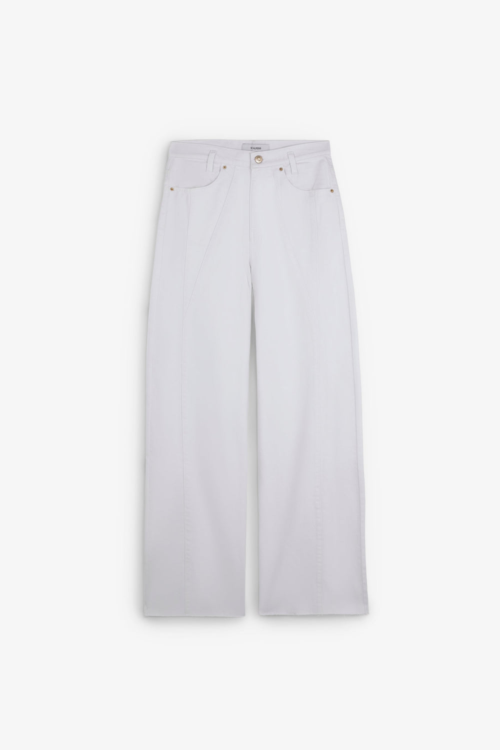 Jeans confeccionados en 100% Algodón. Tiro alto. Cuatro bolsillos. Pernera ancha. Detalle de costuras. Cierre frontal con cremallera y botón.