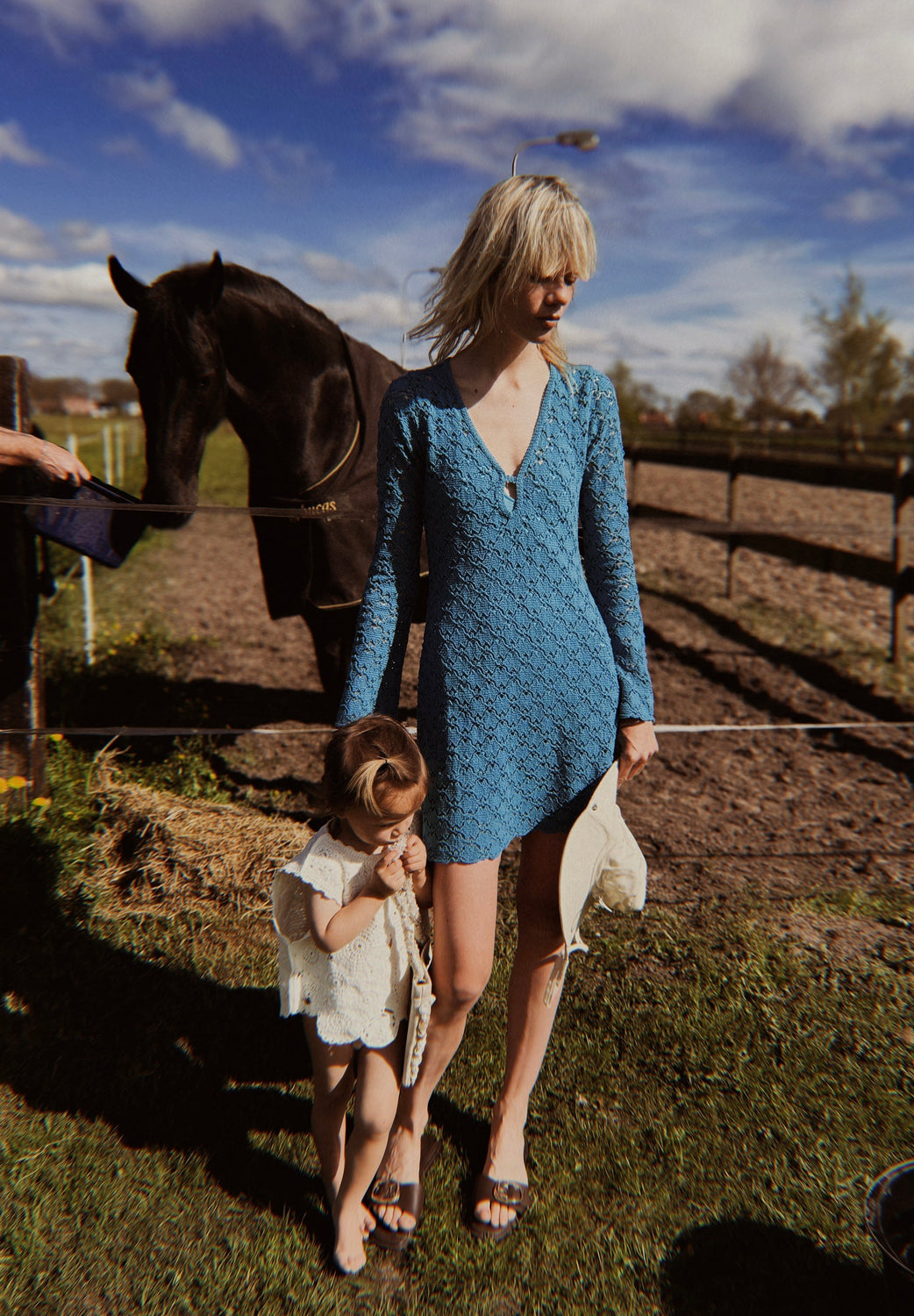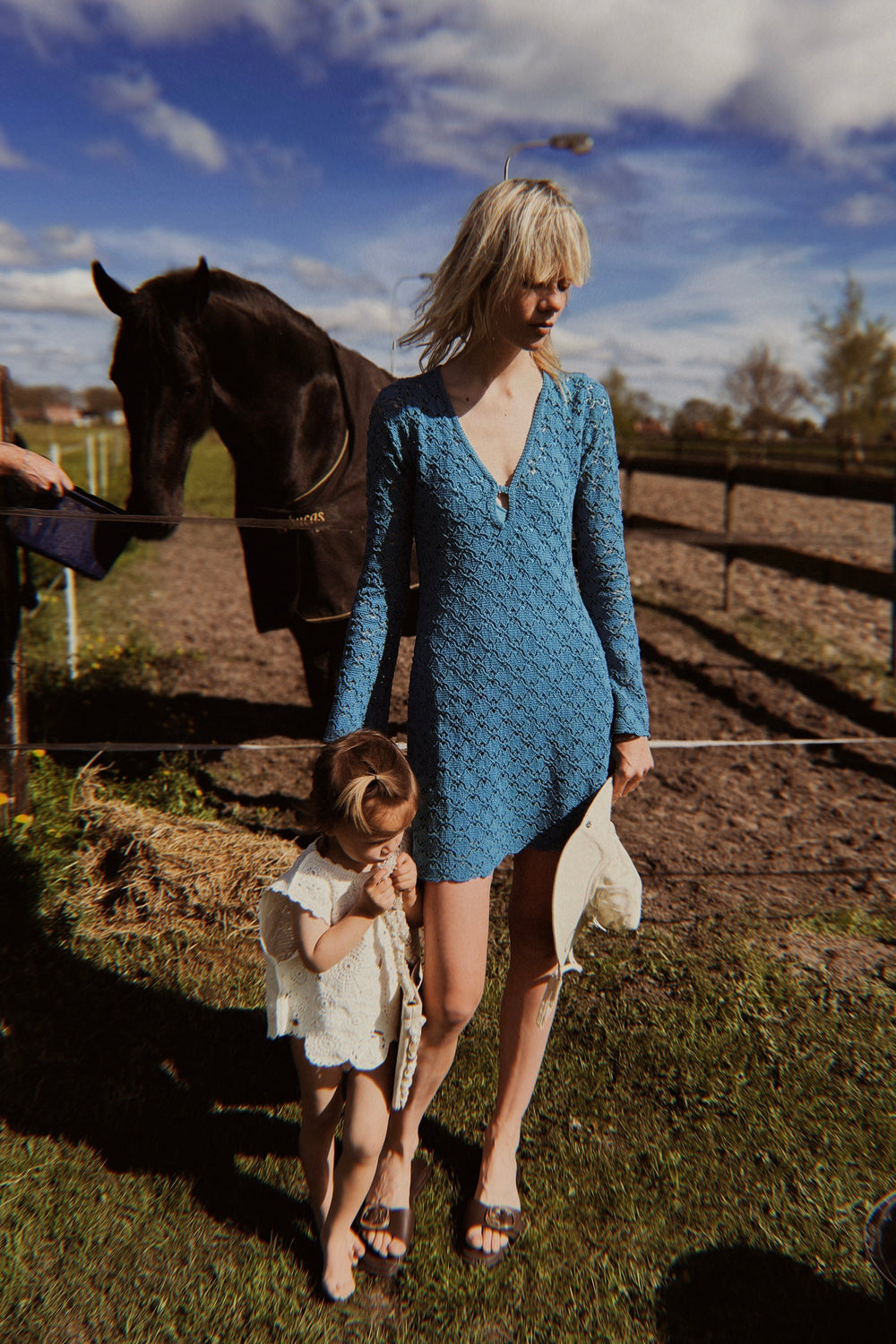 Vestido mini confeccionado en crochet ligeramente elástico. Corte regular fit, escote en V con abertura y manga larga ligeramente acampanada. Forro interior.