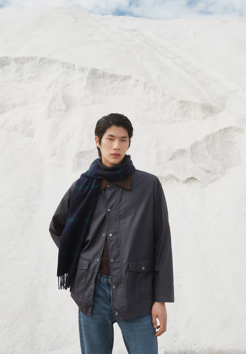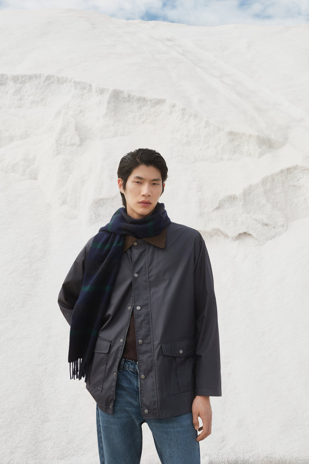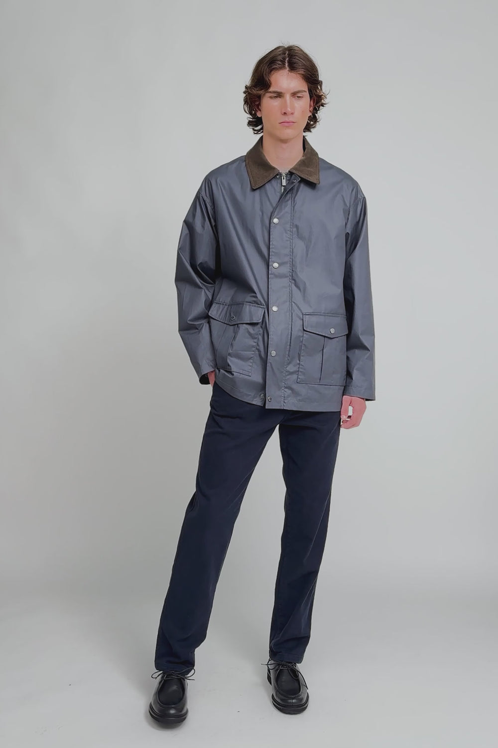 Chaqueta encerada confeccionada en 100% algodón BCI. Regular fit, cuello de pana y cierre con cremallera y snaps con tapeta. Manga larga y bolsillos de parche con snaps.