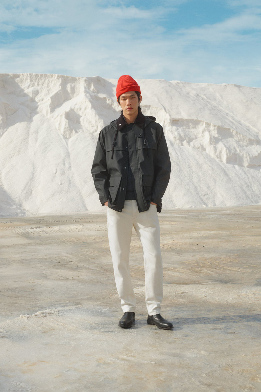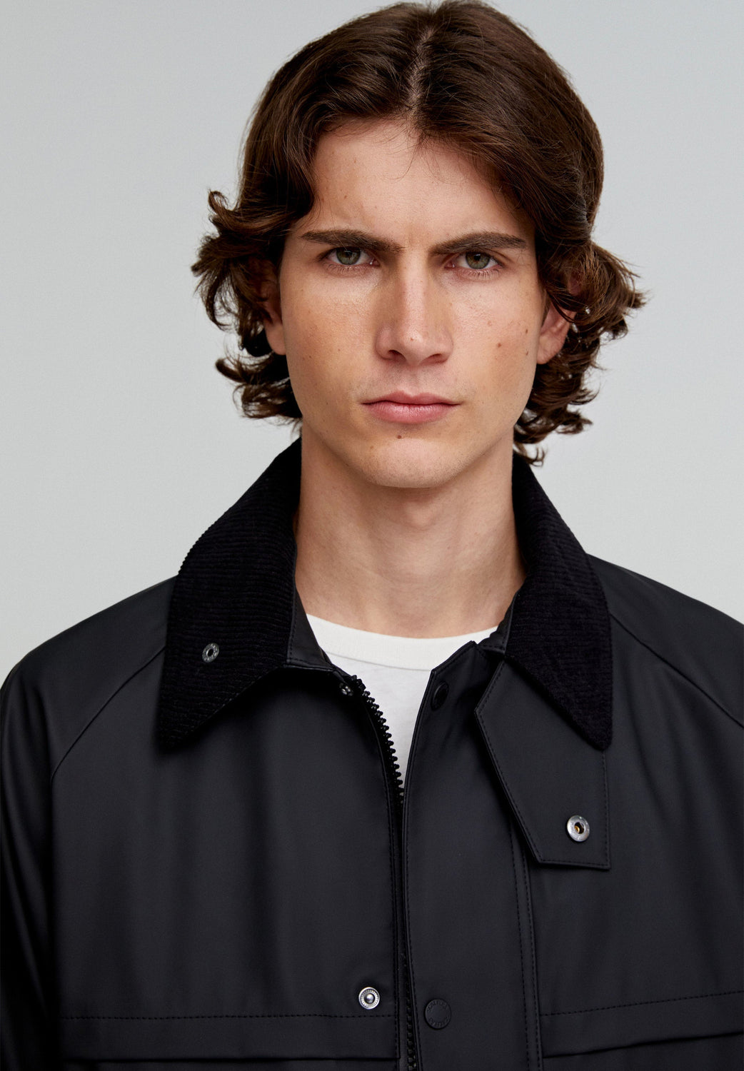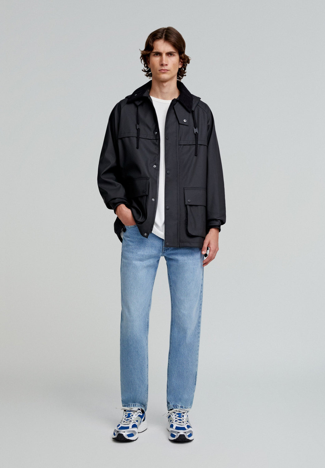 Chaqueta confeccionada en tejido técnico. Regular fit, cuello clásico de pana con capucha desmontable y cierre con cremallera y snaps. Manga larga terminada en puño ajustable con velcro con cremallera y rejilla en sisa para transpirar. Bolsillos frontales con tapeta y snaps. Cremalleras traseras y bajo ajustable.